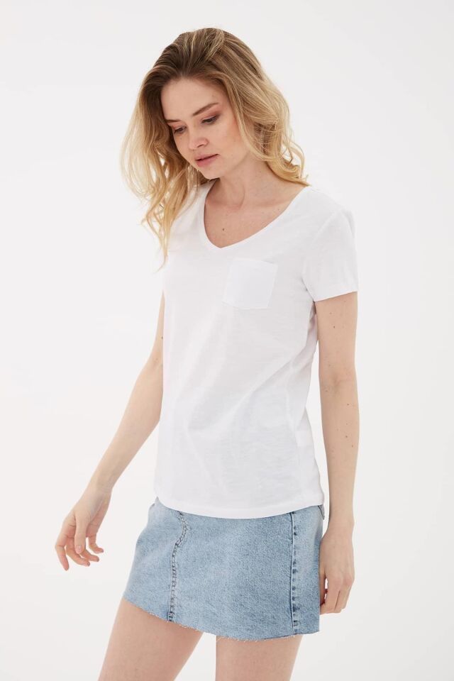 V Yaka Cepli T-Shirt Ekru / Ecru Kadın T-Shirt | Fashion Friends Manken Ölçüleri: Boy: 1.74, Göğüs: 85, Bel: 60, Basen: 88 Mankenin Üzerindeki Ürün: S / 36 Beden